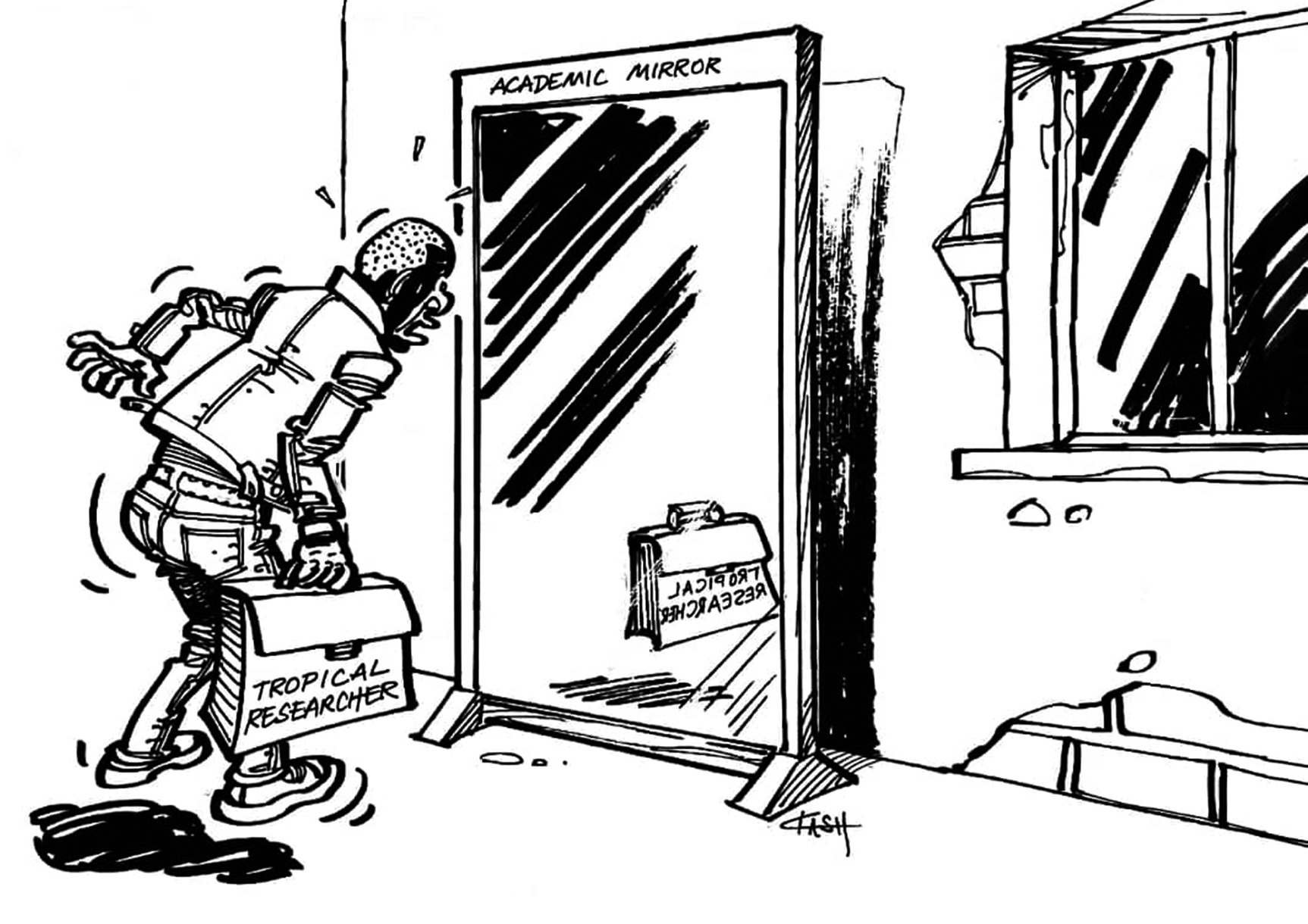 The Bukavu series shows what this looks like at its best. In the online exhibition, Congolese political cartoonist Tembo Kash turns the politics of research partnerships into images that stay with you. The “Academic Mirror” is the one I return to. A Congolese researcher looks into a mirror and finds he has vanished, leaving only his briefcase behind. Data without recognition. Labour without authorship. It is a sharper critique of extractive partnership dynamics than most of the prose we produce about “equity”. And it travels because it gives people a shared reference point. You don’t need a technical background to understand the point, and you don’t need a long attention span to remember it.