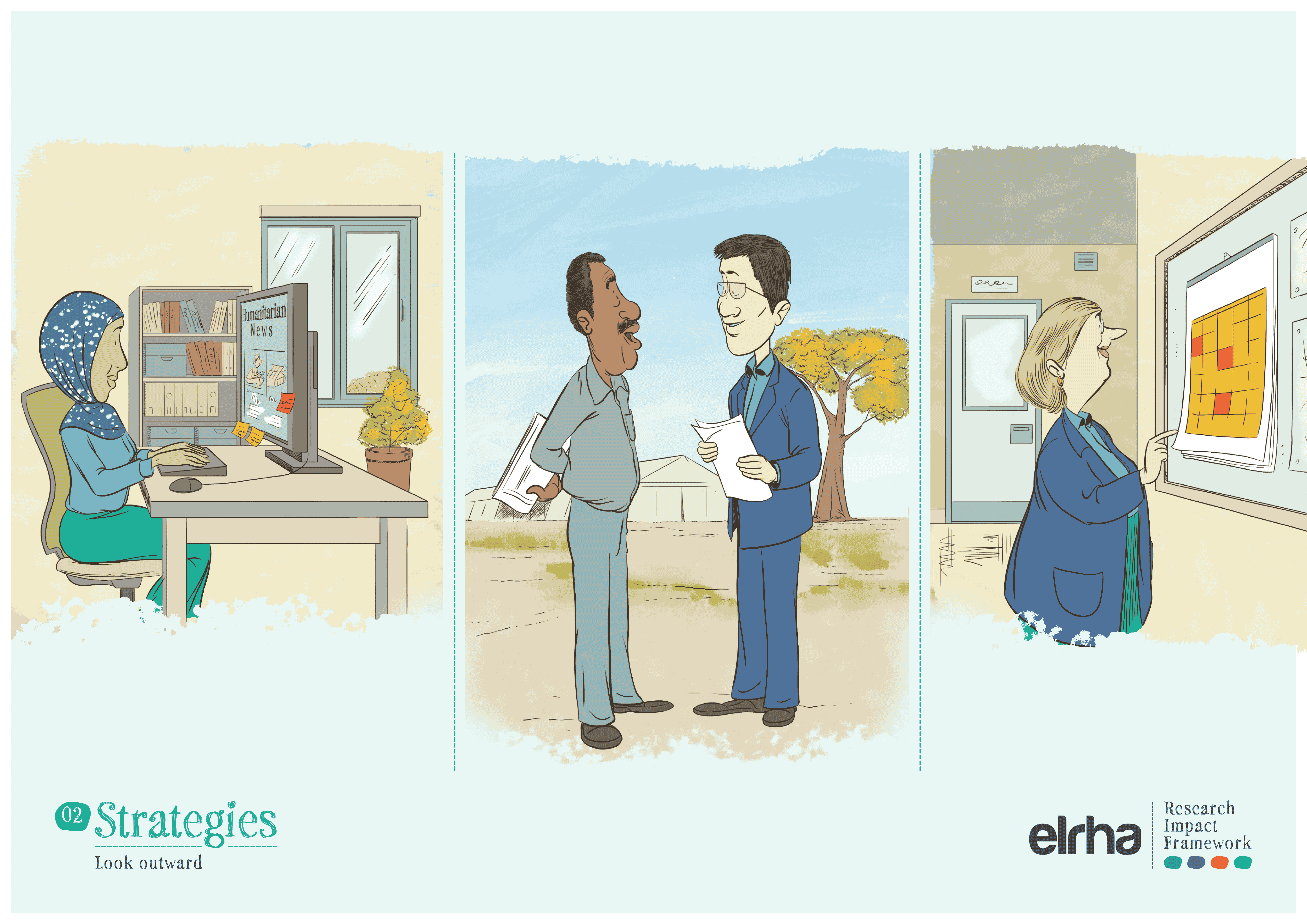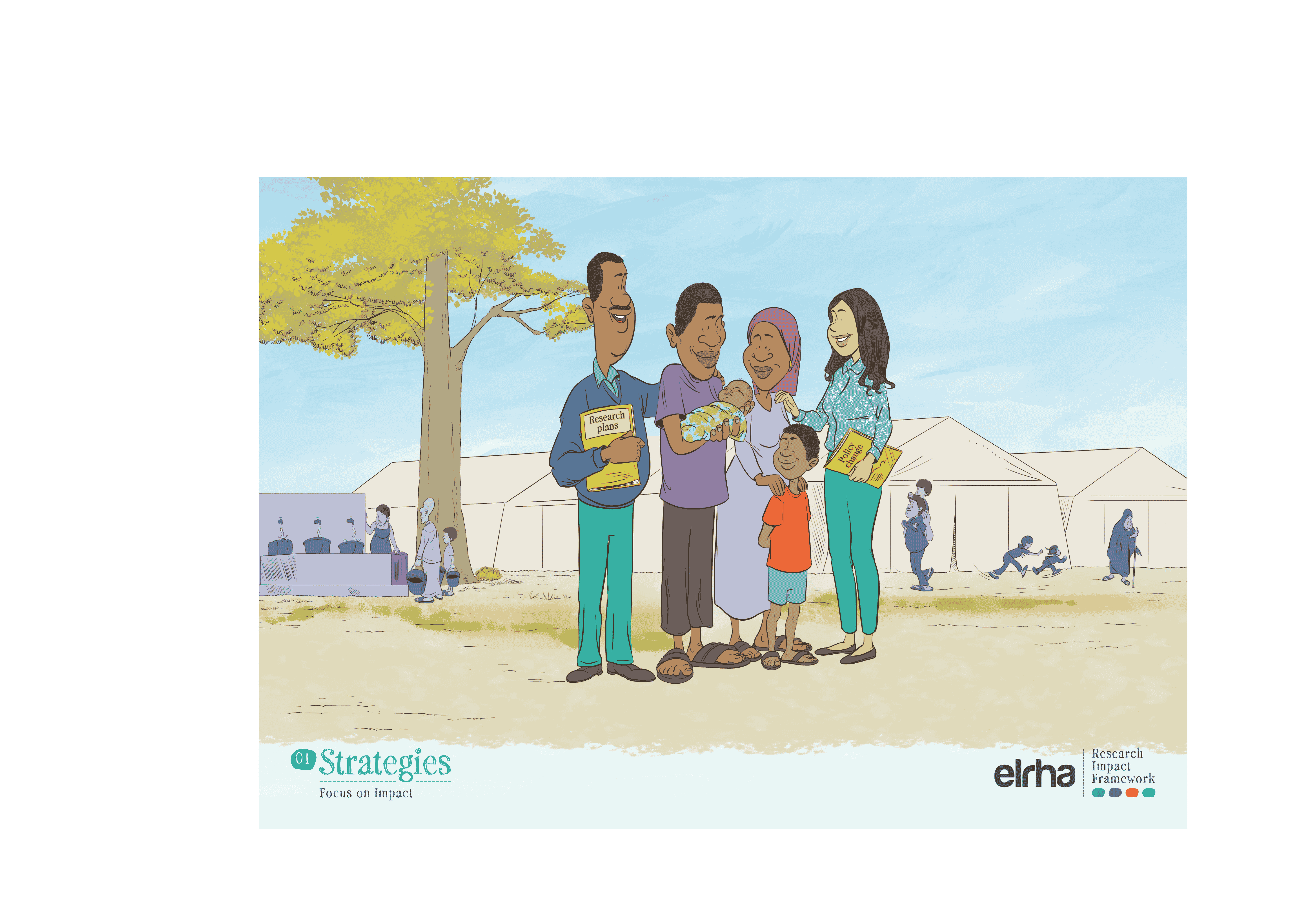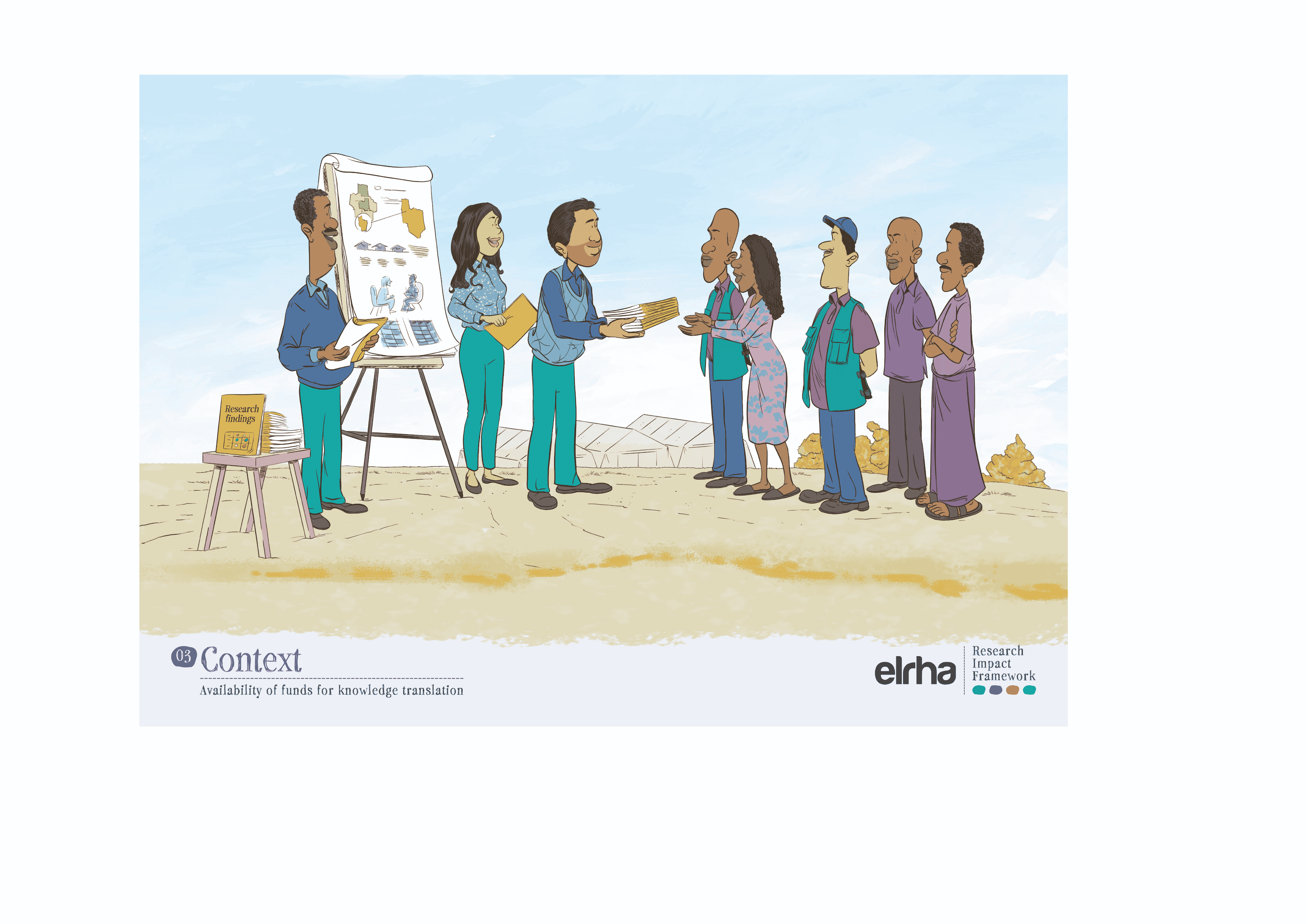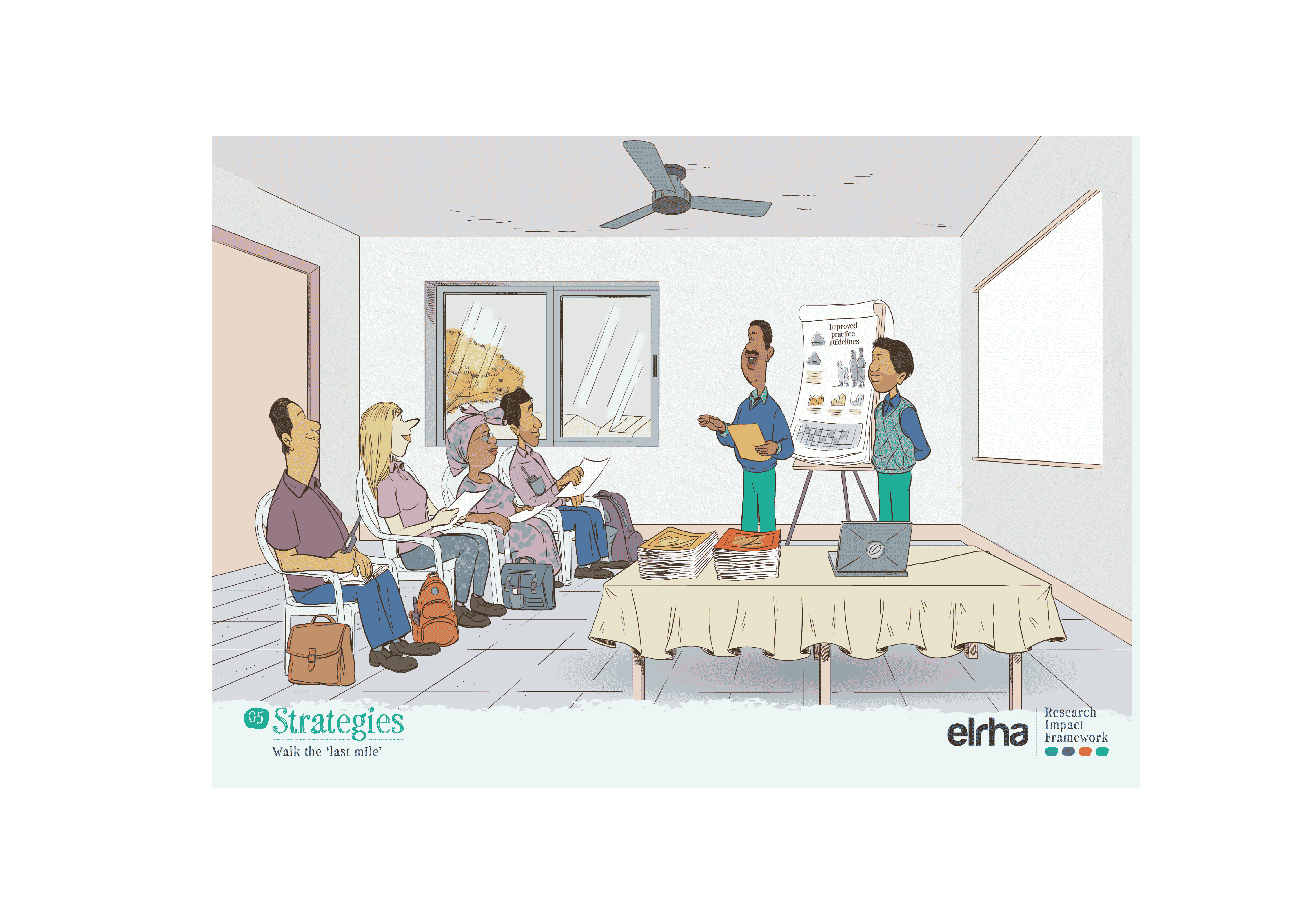 That is why a systems-focused resource like the Research Impact Framework benefited from illustration. The Framework provides guidance on how humanitarian health research can better influence policy and practice. It sets out five strategies and nine enabling conditions that shape impact. Useful, yes, but still abstract when presented only as text or a diagram. Ahead of the Research Forum in Nairobi in 2025, we worked with an East African illustrator to translate those strategies and enablers into a set of illustrated scenes. The choice of collaborator mattered. If “shifting the power” is a serious commitment, it has to show up not only in who gets invited to speak, but in whose visual language we use to explain the work.
