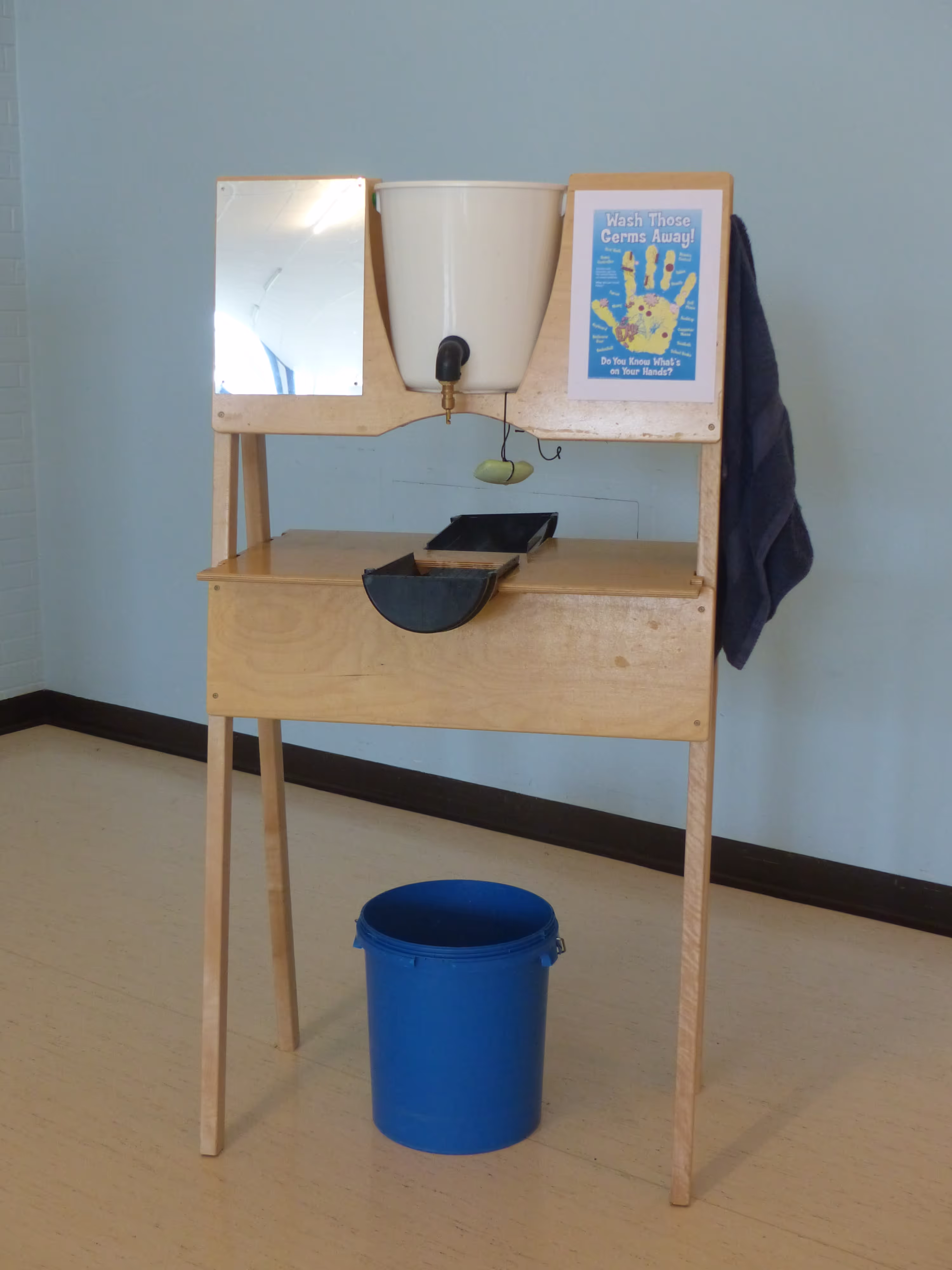 Designed and developed by Beech Grove Academy students in partnership with Oxfam, the first prototype of the OHS, then called the Promotion and Practice Handwashing Kit, had an ‘A-frame’ superstructure capable of holding different locally-available water containers combined with soap, handwashing reminders, and the ‘HandyWash’ water dispenser. The attractive design was height-adjustable for children and wheelchair users and easy to use and maintain, providing dignified handwashing facilities for people in crisis.